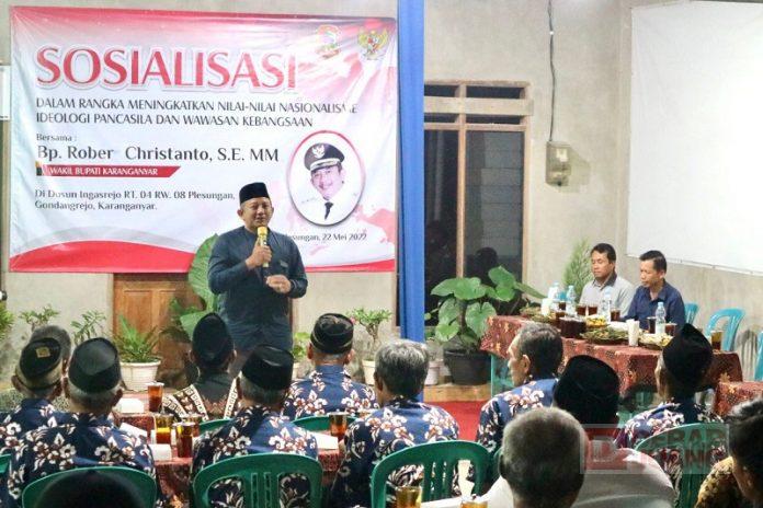 Kabupaten Karanganyar – Wakil Bupati Karanganyar, H. Rober Christanto, S.E., M.M menghadiri dan membuka secara langsung Sosialisasi dalam Rangka Meningkatkan Nilai-Nilai Nasionalisme Ideologi Pancasila dan Wawasan Kebangsaan yang diselenggarakan di Dusun Ingasrejo, Plesungan, Gondangrejo, Minggu (22/5/2022).