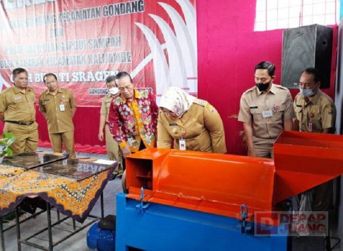 Kabupaten Sragen- Bupati Sragen, Kusdinar Untung Yuni Sukowati atau yang akrab disapa Mbak Yuni meresmikan hasil pembuatan Tempat Pengelolaan Sampah (TPS) 3R, yakni Reduce, Reuse, dan Recycle Desa Gondang, Kecamatan Gondang, Senin (26/12/2022).