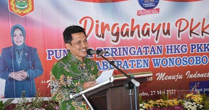 Kabupaten Wonosobo – Bersamaan dengan puncak peringatan Hari Kesatuan Gerak (HKG) PKK ke-49, Tim Penggerak (TP) PKK Kab. Wonosobo meluncurkan jargon baru, yang merupakan inovasi dari TP PKK setempat. Pada puncak peringatan HKG PKK ke-49, Ketua TP PKK Kab. Wonosobo, Dyah Afif Nurhidayat, menyampaikan peringatan HKG PKK, serta rangkaian kegiatan yang telah dilakukan, antara lain, berupa Bakti Sosial (Baksos), webinar, serta kompetisi atau lomba untuk PKK Desa/Kelurahan, (27/5/2021).