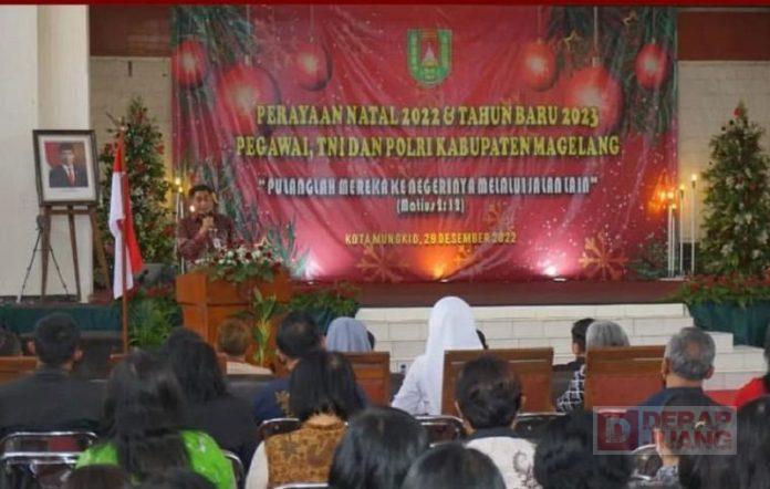 Kabupaten Magelang – Bupati Magelang, Zaenal Arifin bersama jajaran Forkompimda menghadiri perayaan Natal Tahun 2022 dan Tahun Baru 2023 Pegawai, TNI, dan Polri Kabupaten Magelang yang dilaksanakan di GOR Gemilang, lingkup Setda Kabupaten Magelang, Kamis (29/12/2022).