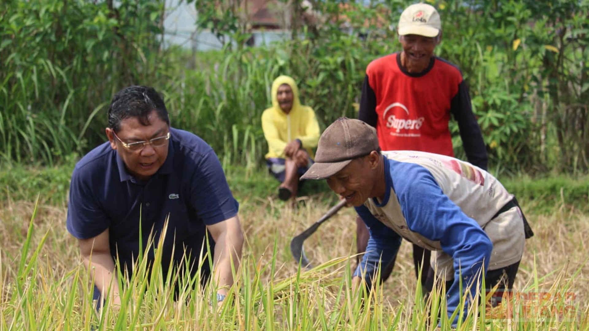Foto: Ketua Fraksi PDI Perjuangan DPR RI, Drs. Utut Adianto (kiri mengenakan baju biru) sedang memotong batang padi saat mengunjungi petani di Banjarnegara dalam ragka serap aspirasi untuk kemajuan pertanian