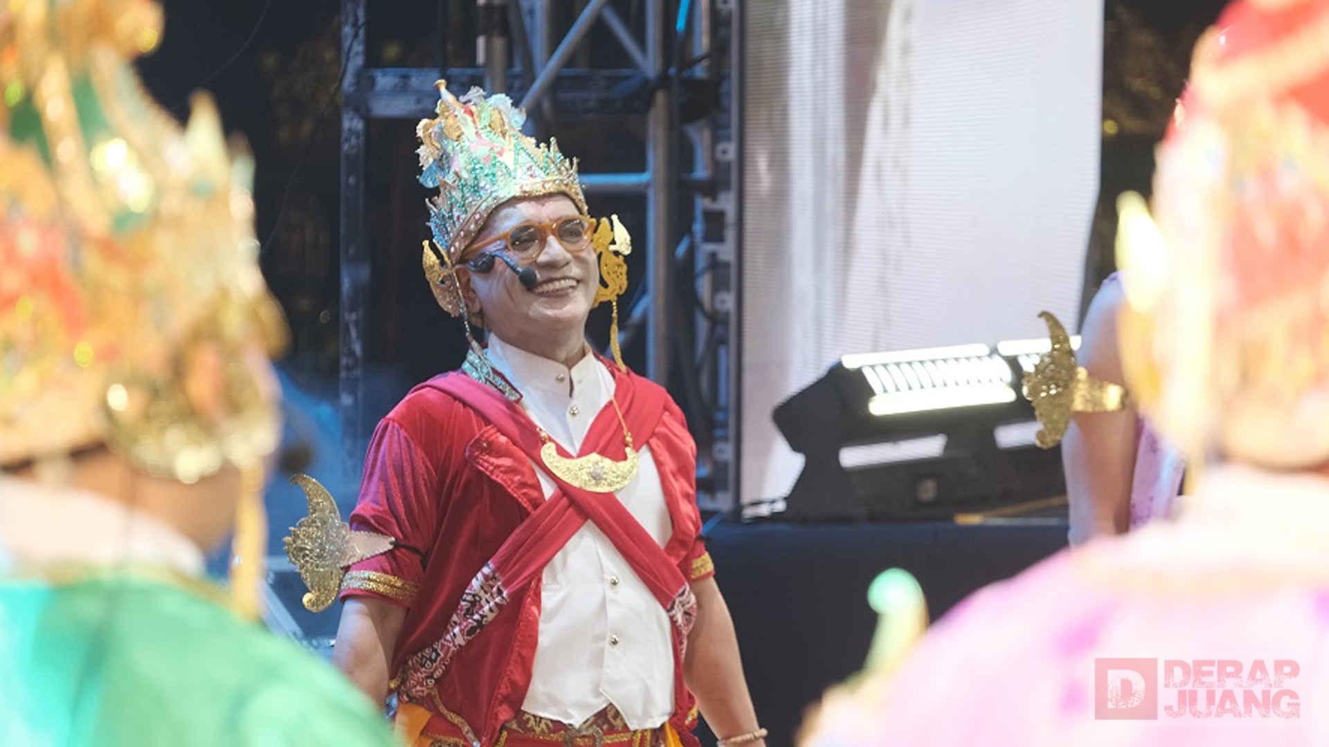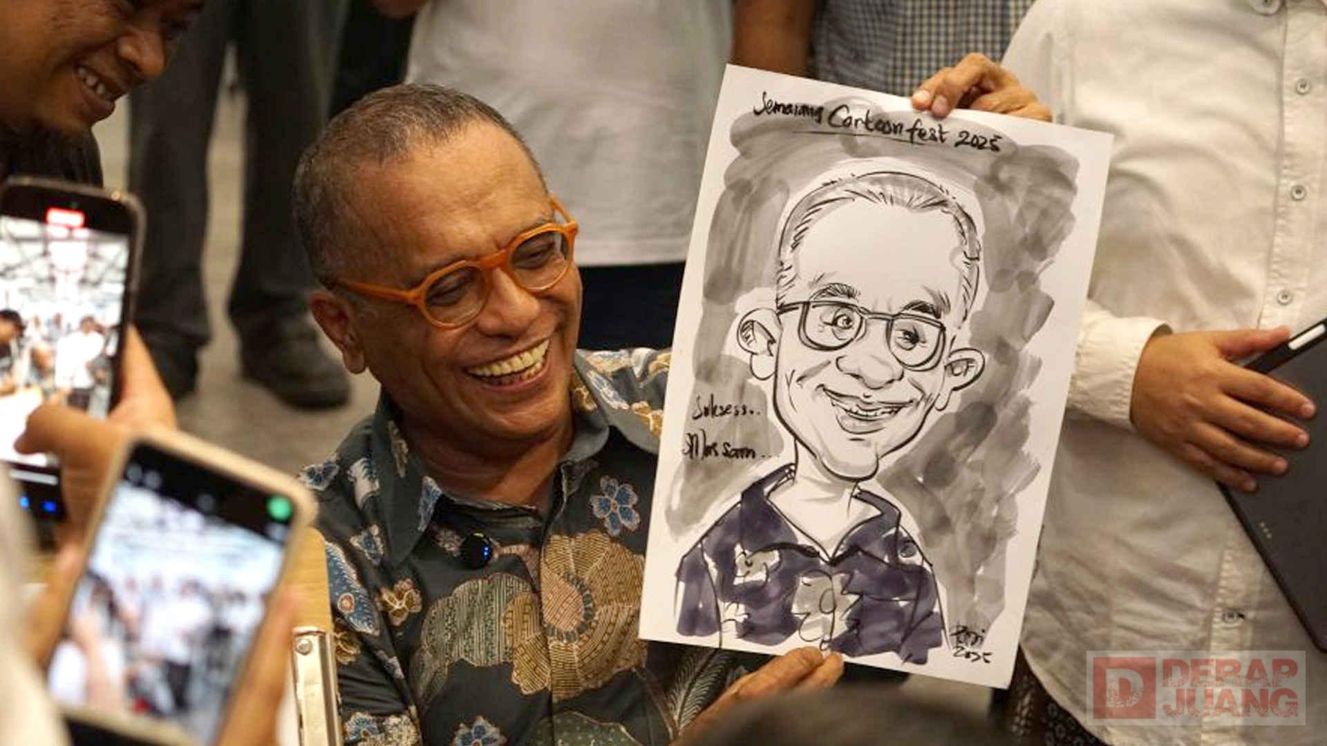 Foto: Samuel Wattimena (kiri) memegang hasil lukisan kartun dari peserta Semarang Cartoonfest 2025, Sabtu (18/10/2025).