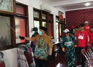 SUKOHARJO - Ketua DPC PDI Perjuangan Sukoharjo, Wardoyo Wijaya, S.H., M.H., M.M. memimpin relawan melakukan penyemprotan disinfektan di kantor DPC Senin (23/3).