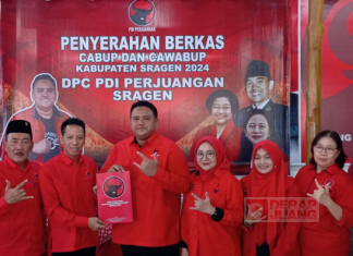 Kabupaten Sragen - DPC PDI Perjuangan Kabupaten Sragen menerima berkas Pengembalian Formulir Pendaftaran Bakal Calon Bupati (Bacabup) Kabupaten Sragen 2024 oleh Untung...