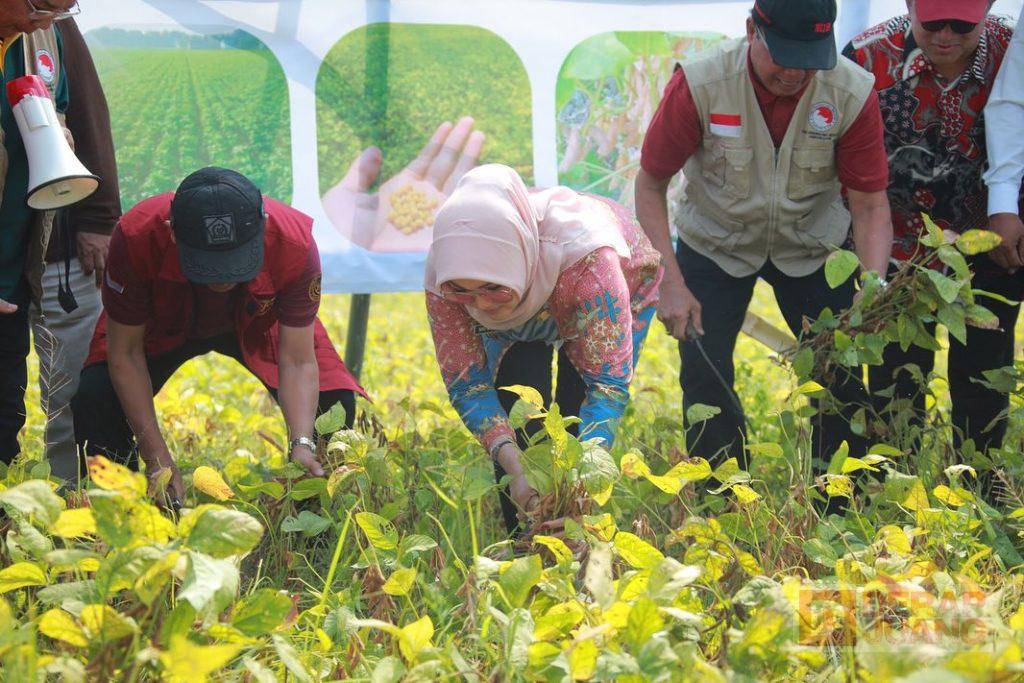 Foto: Bupati Klaten (tengah mengenakan krudung pink) memetik Kedelai di Dukuh Tegalrejo, Desa Tegalrejo, Kec. Ceper, Selasa (10/10/2023).