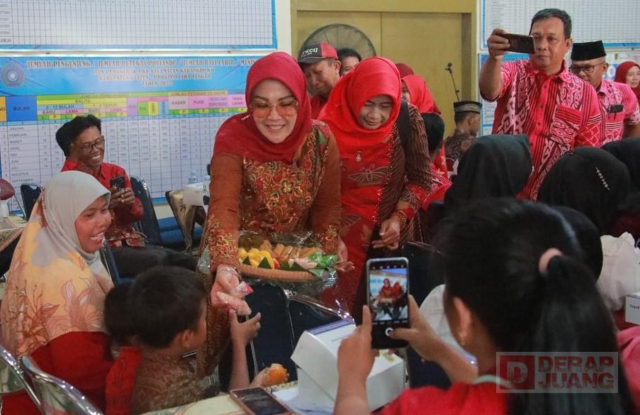 Foto : Sri Mulyani (Hijab Merah – Kacamata) Bagikan Jajanan Tradisional Kepada Anak-Anak Di Acara Penyerahan Bantuan Dari Mbak Puan. Minggu (08/10/2023).